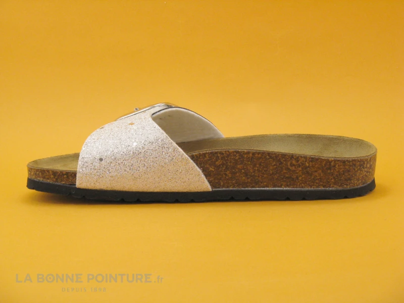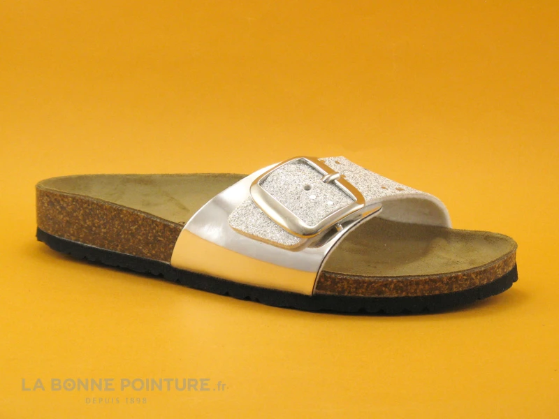 Mules mode Femme pas chères pour l’été, les mules large bride Biomodex 1854 argent !