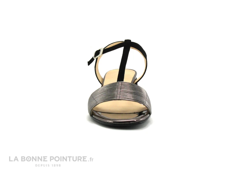 Cette sandale Femme combine un cuir velours noir et un cuir argenté, avec de fines lanières alignées et assemblées sur l’avant.