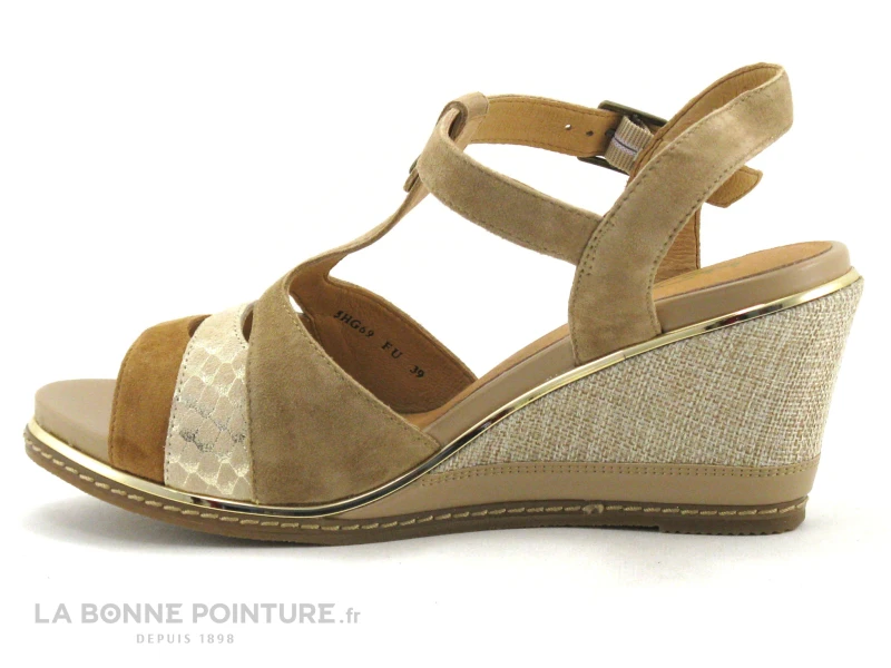 Ces beaux nu-pieds Femme Fugitive sont en cuir velours beige (mastic), avec des bandes camel et imprimé beige et or.