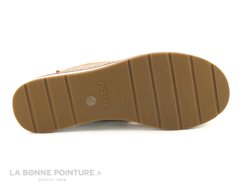 La semelle de marche compensée des nu-pieds Fugitive Kim est blanche avec un liseré marron sur le haut. Le talon est agréable avec ses 5 cm de hauteur (environ).