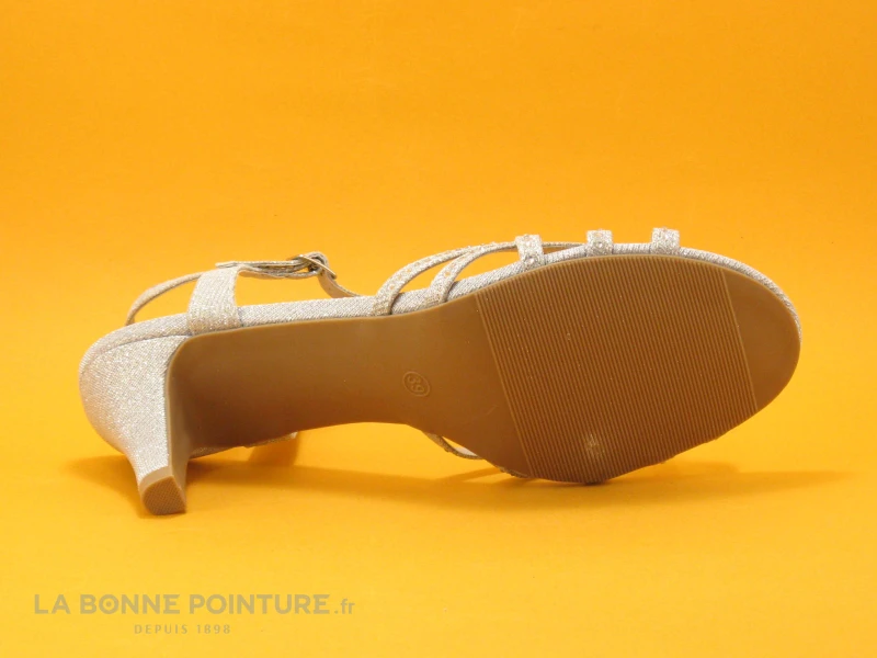 Ce nu-pieds Femme est argent pailleté, avec des petits strass à l’avant de la chaussure.