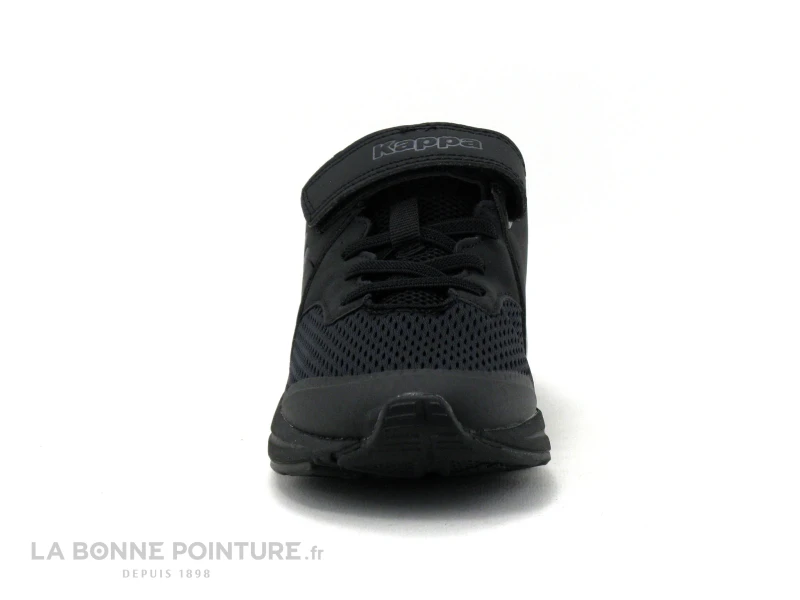 Cette chaussure de running enfant Kappa est en tissu maille et matières synthétiques résistantes noir et gris foncé.