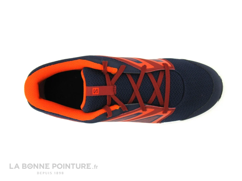 Cette chaussure de marche Salomon est en textile respirant et matières synthétiques résistantes bleu marine, avec les côtés rouge/bordeaux et orange.