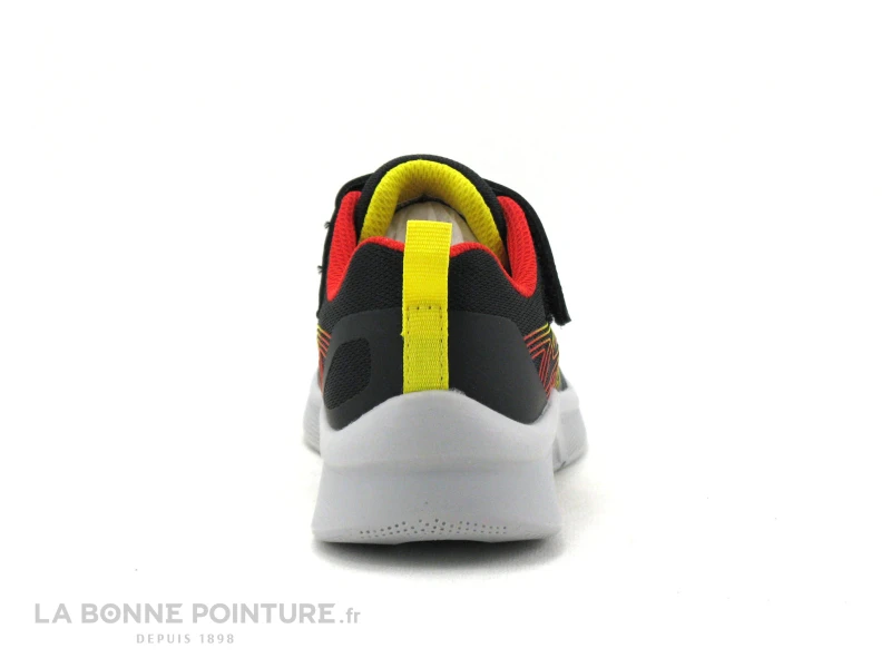 Cette basket mode garçon Skechers est en textile noir et matières synthétiques, avec du jaune et du rouge sur les côtés.