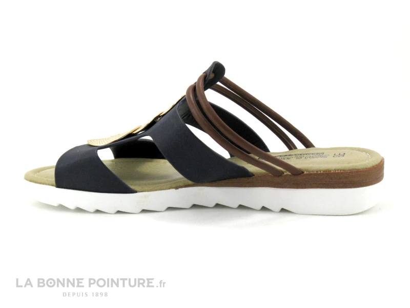 Cette mule Femme bleu marine et marron est ornée de trois cercles dorés fixés sur le dessus de la chaussure.