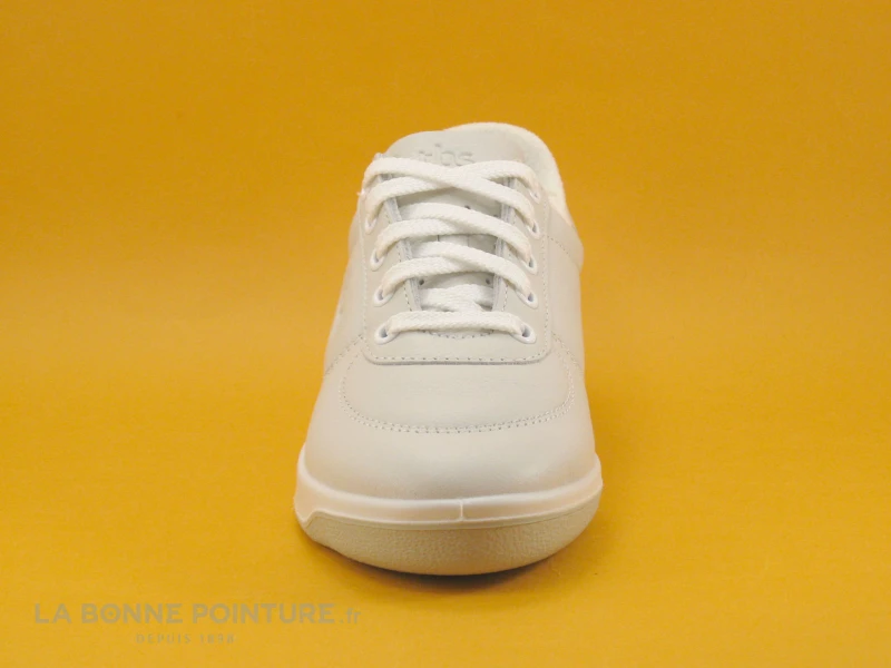 Le dessus des chaussures est en cuir blanc aspect grainé, gravé du logo TBS sur la tranche extérieure et le contrefort arrière.